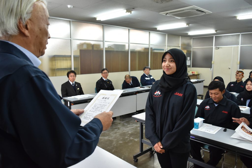 式では、同連絡会の中原順朗会長が「文化や生活環境の違う中で不安なことも多々あったと思うが、3年間精一杯頑張ってくれた。今回皆さんが無事に元気で帰国の途に就くことができ良かった。日本で経験・学んだことを今後の人生に活かしてほしい」と挨拶し、感謝状と記念品を贈呈。また、実習生一人ひとりが実習期間中の思い出や感謝の思いなどを綴った作文を流暢な日本語で発表しました。