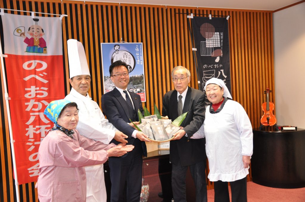 延岡市の郷土料理「のべおか八杯(はちはい)汁」の普及活動を展開する「のべおか八杯汁の会」は12日、延岡市の読谷山洋司市長に「延岡内藤藩御家中料理 八杯汁」のレトルトを贈りました。