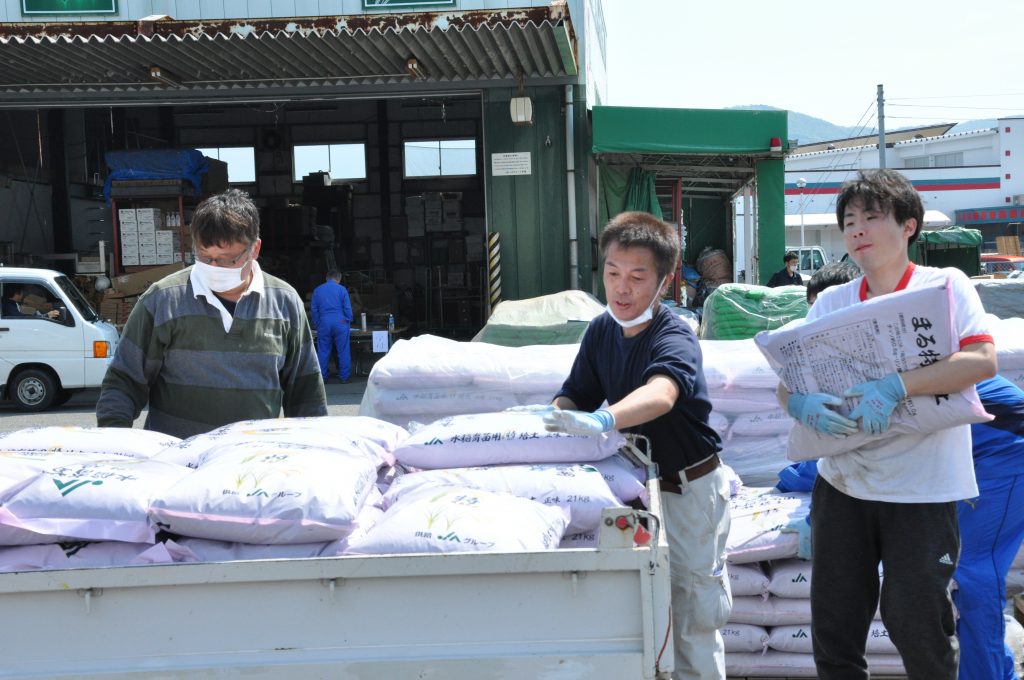 肥料積み込み作業は購買店舗の職員だけでは追いつかないため全支店をはじめ総務部、金融共済部などから2日間に延べ67人が応援に駆け付けました。全員、汗だくになりながら軽トラックに予約した肥料を手際よく積み込みました。