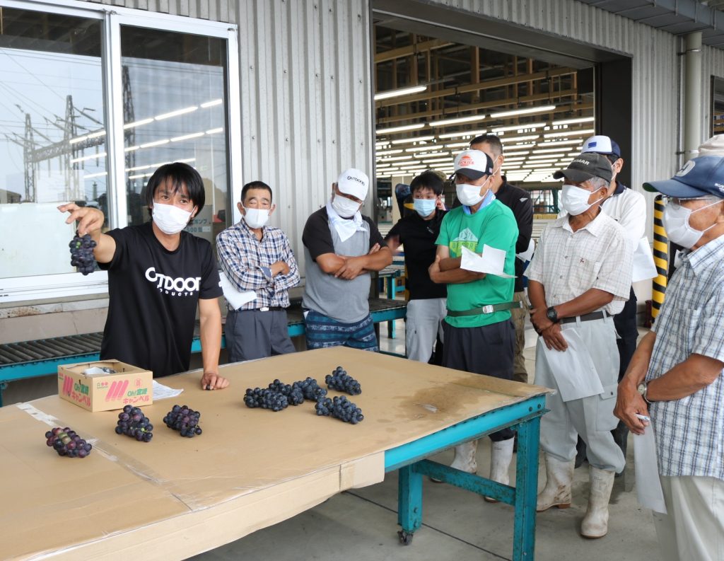 参加者は専門部員、ワイナリー関係者、JA担当職員ら34人。サンプルとなる房を全員で実際に見て比較しながら、着色や房締りといった品質基準や出荷要領などを再確認しました。