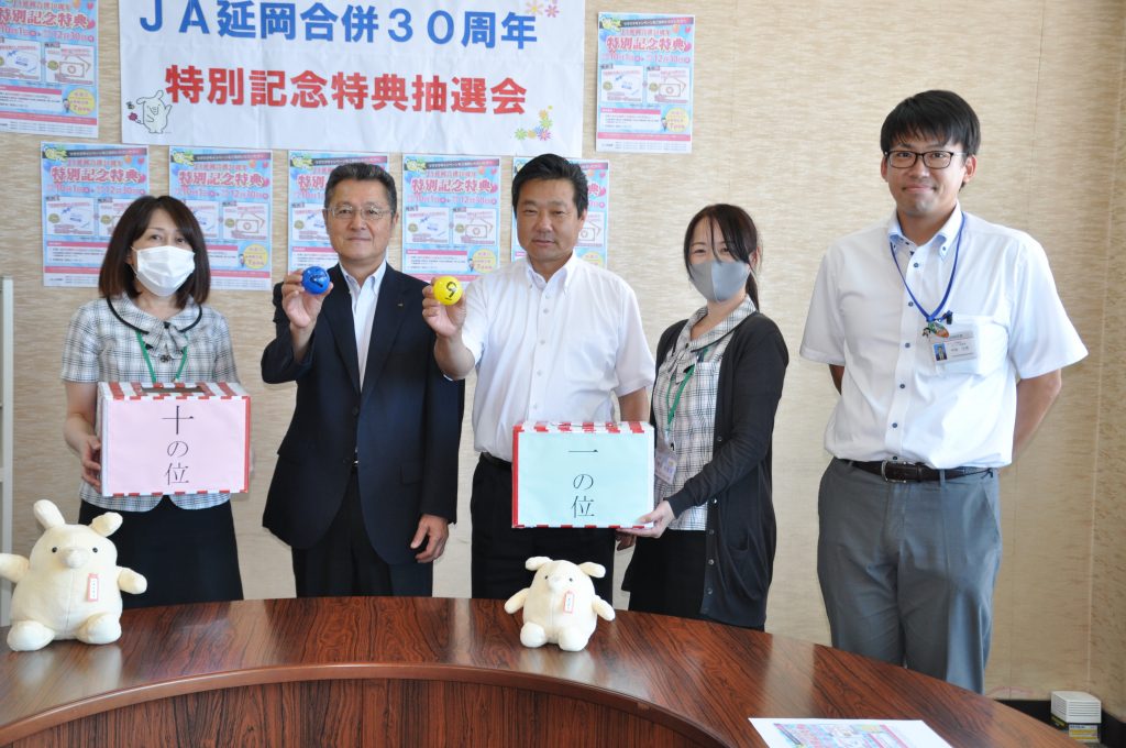 JA延岡は、JA延岡合併30周年特別記念キャンペーンの抽選会を7月22日、本店第2会議室で実施しました。楠田富雄組合長と川原博之副組合長がJAバンク推進課の甲斐文規・地区担当の立ち合いのもと厳正に抽選をしました。重黒木充常務、金融・共済部の富高英雄部長も同席。当選発表は、賞品の発送をもってお知らせします。