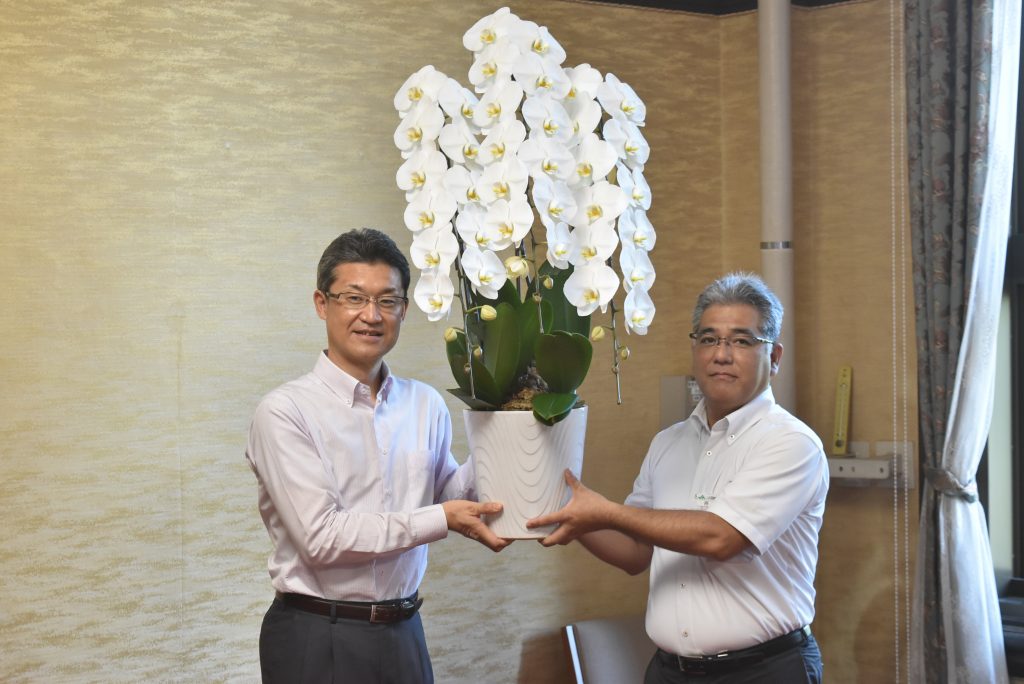 21日には、押川和範会長(JA宮崎経済連園芸部長)と小倉幹哉副会長(宮崎県市場連絡協議会会長)の2人が河野俊嗣宮崎県知事を表敬訪問し、取組み報告とコチョウラン、フラワーアレンジメントの贈呈を行いました。