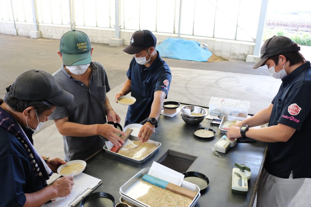 稲刈りが始まったのは23日。今年は梅雨明けが大幅に遅れたため、例年に比べ5日ほど遅い検査となりました。検査員たちは、フレコンバッグで持ち込まれた米を専用の分析器を使って水分率などを計測。等級を判定しました。