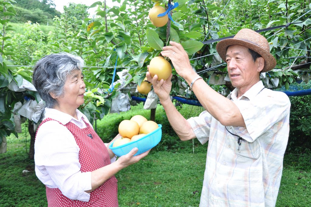 富山さんは元公務員。ナシ栽培は父から「以前、この付近でナシ栽培をする人がいた」と聞き、この地でナシが育つことを知ったのがきっかけです。2012年から本格的に取り組み、収穫は今年6年目。「食べ物は安全・安心が第一」と自ら草堆肥を作るなど徹底した有機栽培を貫きます。この努力が実り、富山さんのナシを心待ちにしている人が多いです。