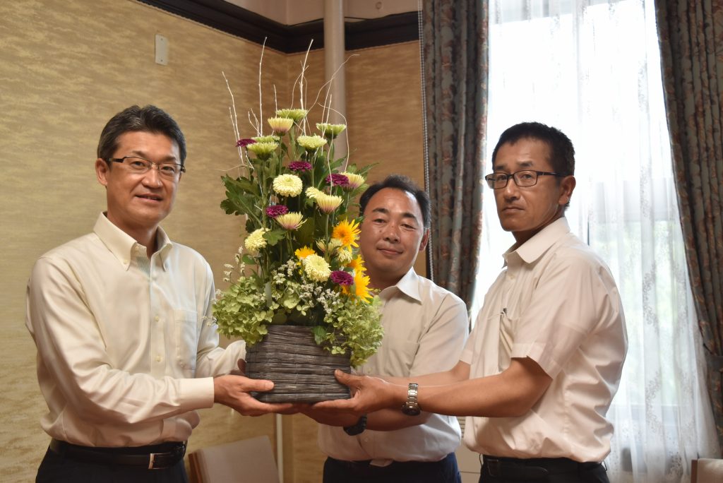 その後稲田部会長と宮崎県花き生産者連合会キク部会長田爪隆二部会長から県産菊を彩ったフラワーアレンジメントの贈呈が行われました。