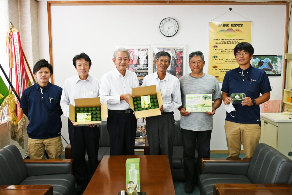 宮崎県のJA都城へべす生産部会の野上羊一部会長ら5人は9月4日、JAの久保順一組合長と都城市の池田宜永市長を訪問し、今年の8月から初出荷が始まった「ヘベス」を贈呈しました。