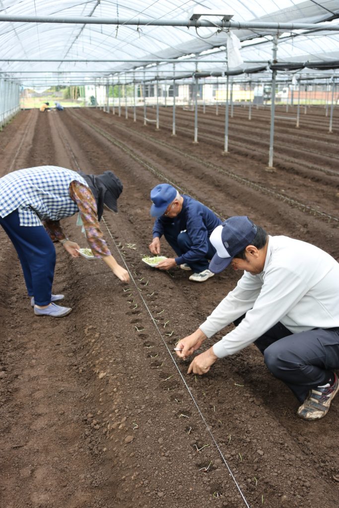 都農町松原地区で17アールを栽培する門田守生部会長(53)のハウスでは、15、16日の2日間でロイヤルチェリー、ロイヤルホワイト、グレースなど全8品種を定植しました。種から細い芽が5センチほど伸びた苗を、12センチ間隔で植えていきます。一つ一つ手作業で約1万9千本。