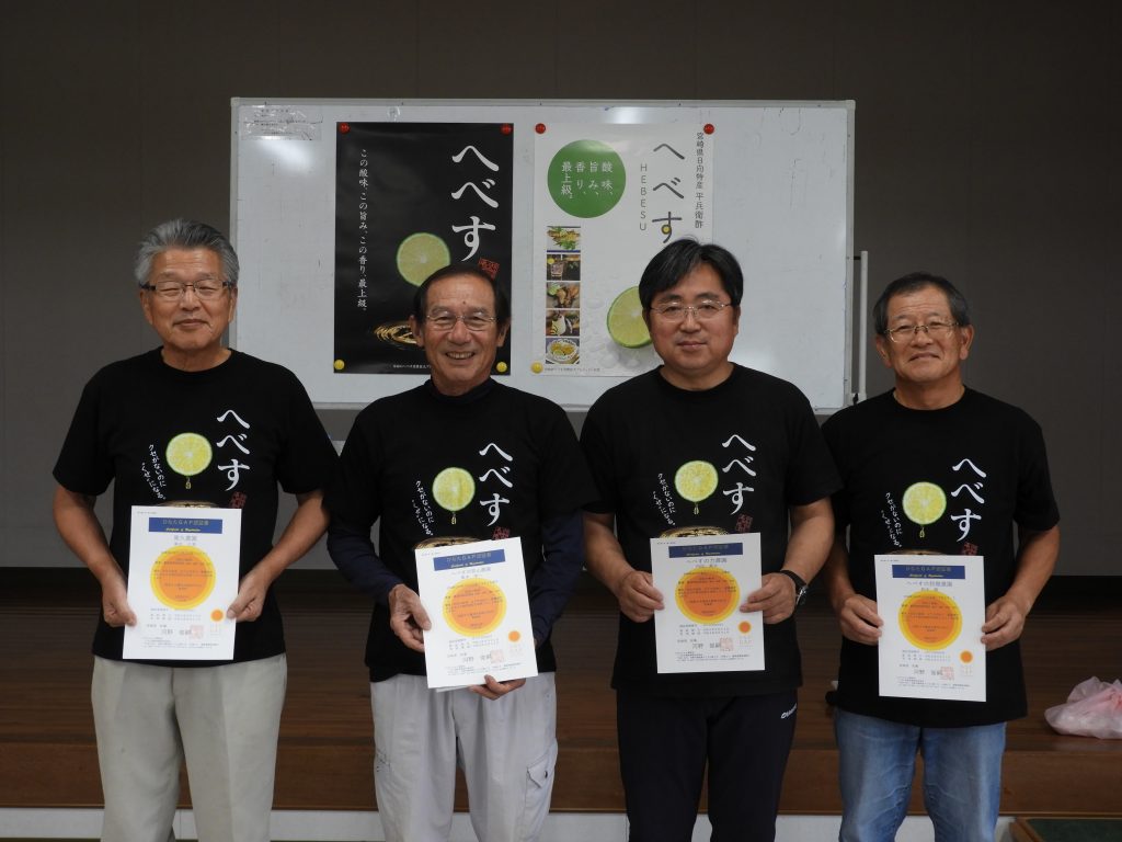 日向市では2018年から現在まで6件の認定がありましたが、その全てが平兵衛酢部会となりました。今回は3~6件目の認証を受けた、同部会の黒木久男さん、黒木常一さん、内田勇次さん、鈴木徹さん、4名の生産者が交付式に出席しました。