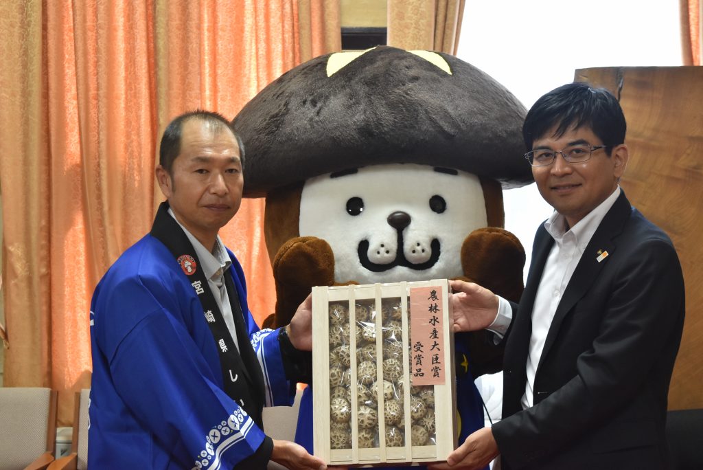 JA宮崎経済連と宮崎県しいたけ振興会は、10月15日の「きのこの日」に合わせ、今年4月に開催された第65回宮崎県乾しいたけ品評会審査会の結果報告をするため宮崎県庁を訪れました。