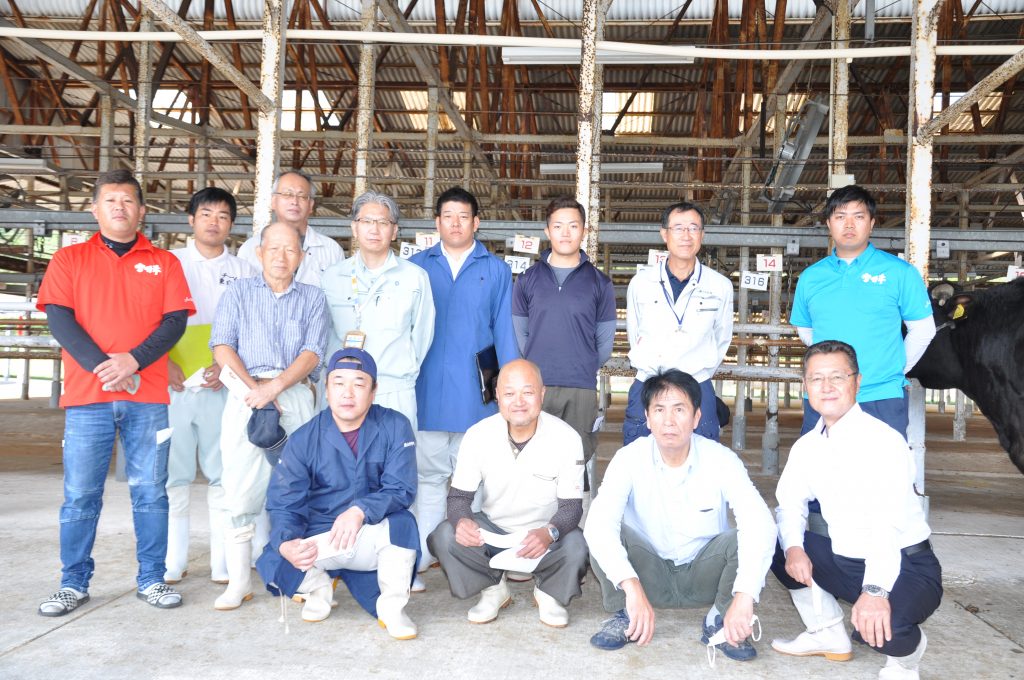 出品者はJA延岡の木村劯(つよし)さん、宮田藤夫さん、甲佐真一さん、星川嘉宏さん、JA日向の林田志朗さん。共進会には県内8団体から100頭が出品。同畜連の出品牛は枝肉重量、肉の光沢、バラ厚など平均して高得点を挙げました。うち2頭はロース芯のサシが最高の12を獲得するなど優勝の原動力となりました。