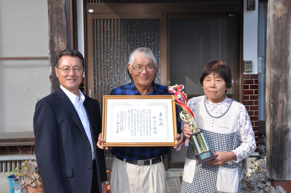 表彰式は11月27日、延岡家畜市場で予定されていた第22回東臼杵郡市肉用牛改良増頭研修会で行われる予定でしたがコロナ禍で中止に。そこで10月27日、両組織の楠田富雄会長(JA延岡組合長)と畜連の白坂秀喜参事が横山さん宅を訪れ、賞状とトロフィーを手渡しました。