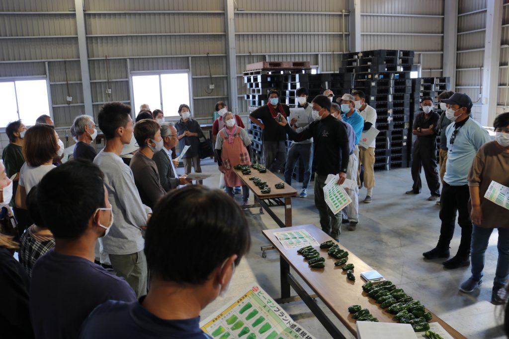 部会員、JA担当者をはじめ、各圃場で収穫作業に携わるパート従業員らも合わせ50人が参加。規格ごとに並べたピーマンを実際に手に取りながら、形・大きさ・色づきなどのA品基準を互いに確認し合いました。