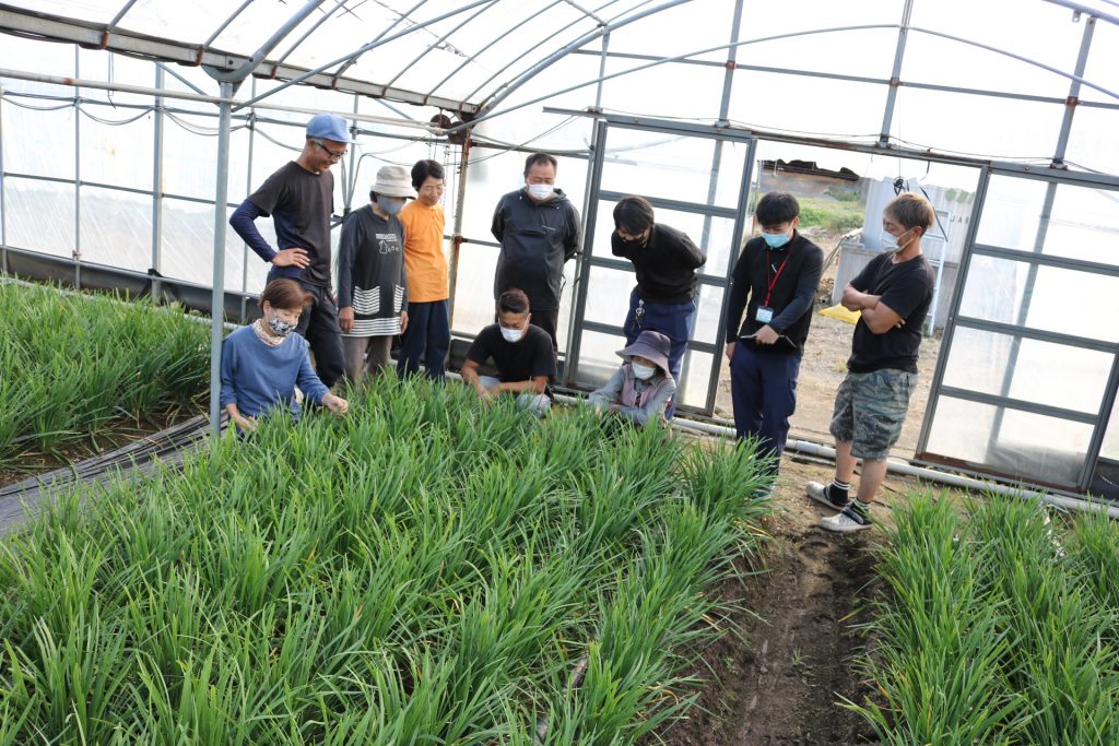 目ぞろえ会の後には管内2か所の圃場で現地検討会を開き、6~7月に定植したニラの現在の生育状況を確認。今後の管理について検討しました。