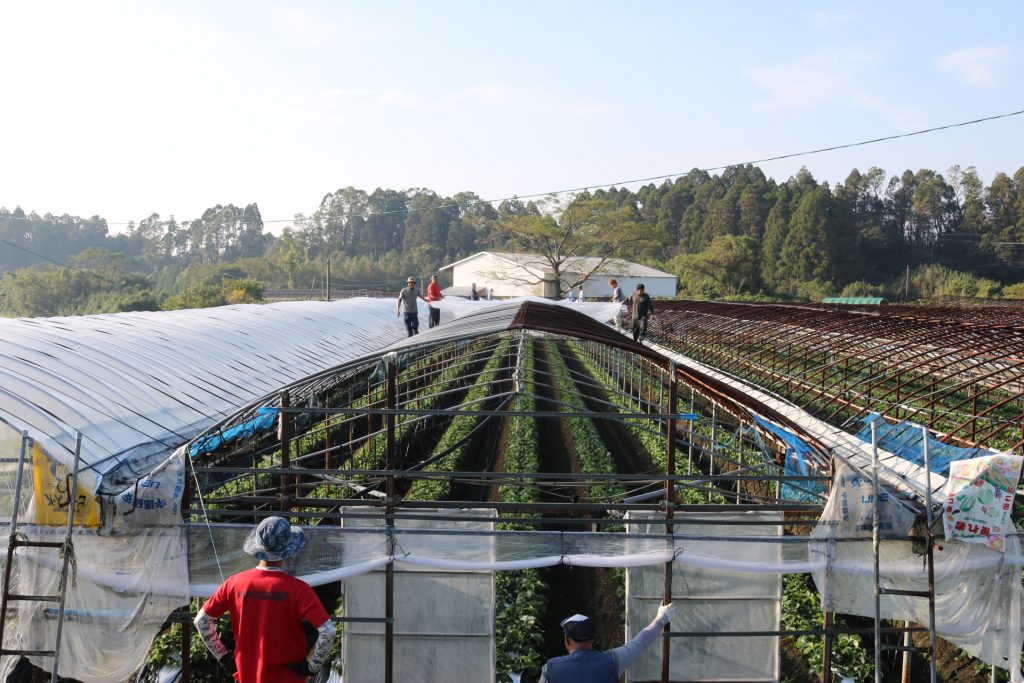 JA尾鈴いちご部会青年部は10月27日、管内市納地区の部会員・永峰芳男さん(68)のハウスのビニール展張作業を行いました。