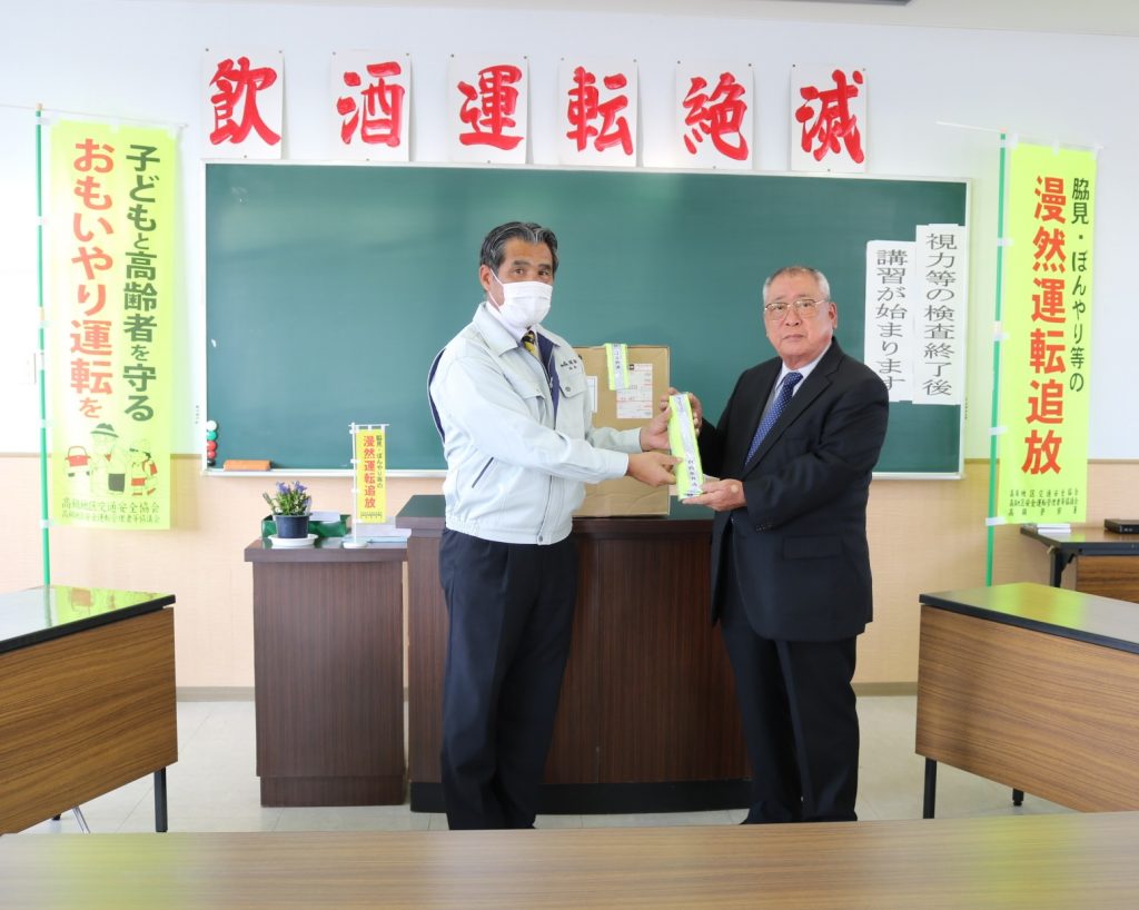 JA尾鈴は10月28日、地域の交通安全啓発に役立ててもらおうと、高鍋町の(一財)宮崎県交通安全協会高鍋地区交通安全協会へ、蛍光反射タスキ500本を贈呈しました。交通安全グッズの贈呈はJA共済の地域貢献活動の一環として定期的に行っています。 贈呈式では、JA尾鈴金融共済部・滝本修部長が、同協会・小澤浩一会長に手渡しました。 小澤会長は「反射タスキは夜間の危険防止に大変効果があるので、ありがたい。高齢者や運転免許更新者へ配布するなどして活用します」と謝辞を述べました。