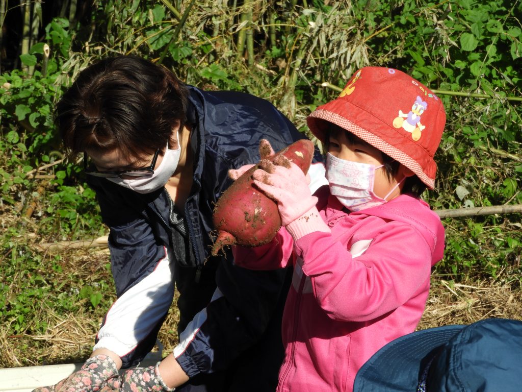 参加した親子は協力して、サツマイモのツルを切り、マルチシートを剥がして芋を掘りあげました。自分の顔ほどもあるサツマイモを収穫した子どもらは「大きい芋がたくさん獲れて嬉しい。また芋掘りをしたい」「芋を土の中から掘り出すのがたいへんだった」と話しました。収穫したサツマイモは自宅に持ち帰り、焼き芋やスイートポテト、みそ汁など思い思いに料理するとのこと。
