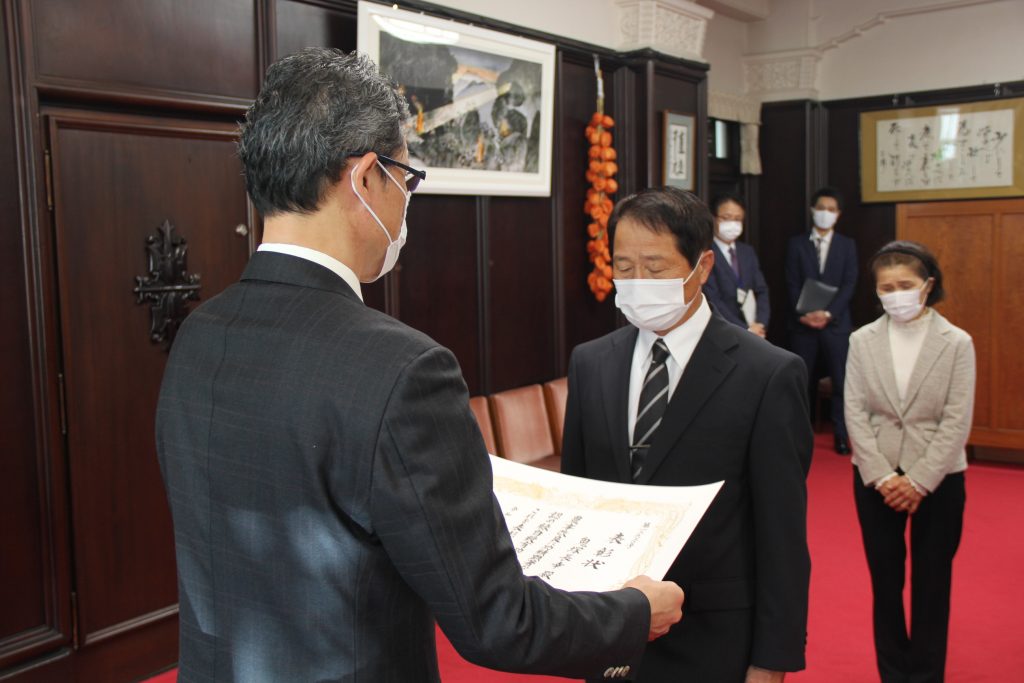 宮崎県における促成カラーピーマン経営のモデルとして産地づくりを牽引し、地域農業の発展に貢献したとして、西都市三宅の鬼塚長幸さん(62)が、公益社団法人・大日本農会から令和2年度の農事功績表彰者として「緑白綬有功章」を受けました。本来であれば、東京で表彰式が開催されますが、今年は新型コロナウイルス感染症により中止。これにより19日、知事室で伝達式が行われました。