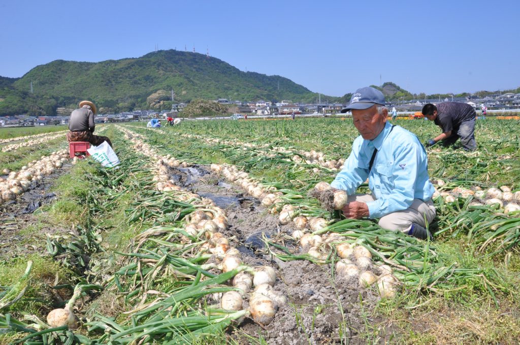 掘り出した玉ネギは1、2日ほど天日干しし、葉をカットしてからコンテナかご(約20キロ)に入れ、同市塩浜町のJA塩浜選果場に出荷します。品種は「貴錦」と「ソニック」。適度な降雨と暖冬で玉太りは上々で収量40トン以上を見込みます。