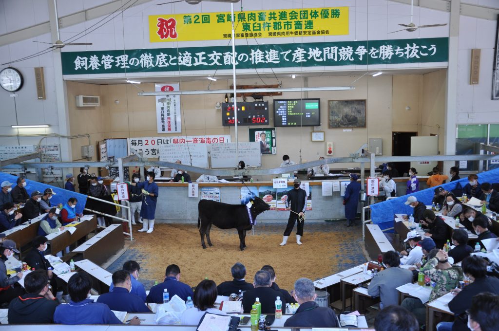 検査は雌子牛を対象に実施。任意だが生産者のBL清浄化への意識が高く今回の検査の受検率は95%でした。「ひがしクリーン牛」は、場内掲示板だけでなく、同畜連のホームページにも掲載しています。雌子牛せり市上場時、BL検査結果の公表を始めたのは県内7市場中4番目。3月期子牛せり市は17、18の両日、櫛津町の延岡家畜市場で開かれました。雌302頭、去勢309頭の611頭が出場。平均価格は78万6941円。前回比1万0832円高、前年同期比13万8806円高と高値を堅持しました。最高値は雌143万3300円、去勢138万9300円。