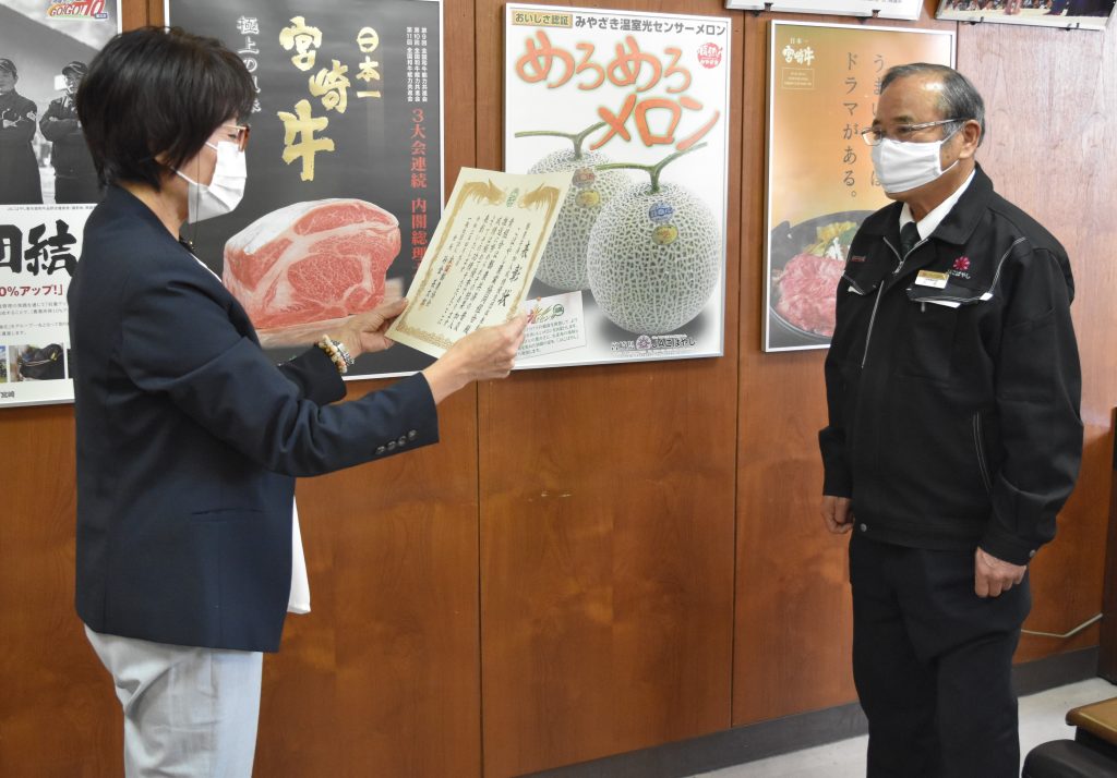 表彰式では全国酪農協会・酪農共済九州地区担当の蓮尾知子所長からJAの入佐美昭組合長と福嶋チーフに表彰状が送られました。