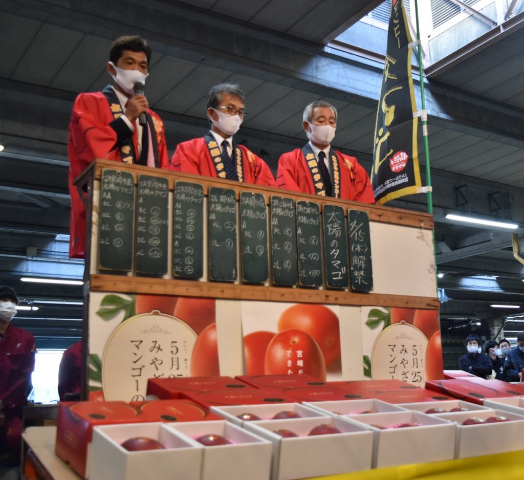 みやざき完熟マンゴー「太陽のタマゴ」の販売が15日、全国一斉にスタートし、33市場で初競りが行われました。