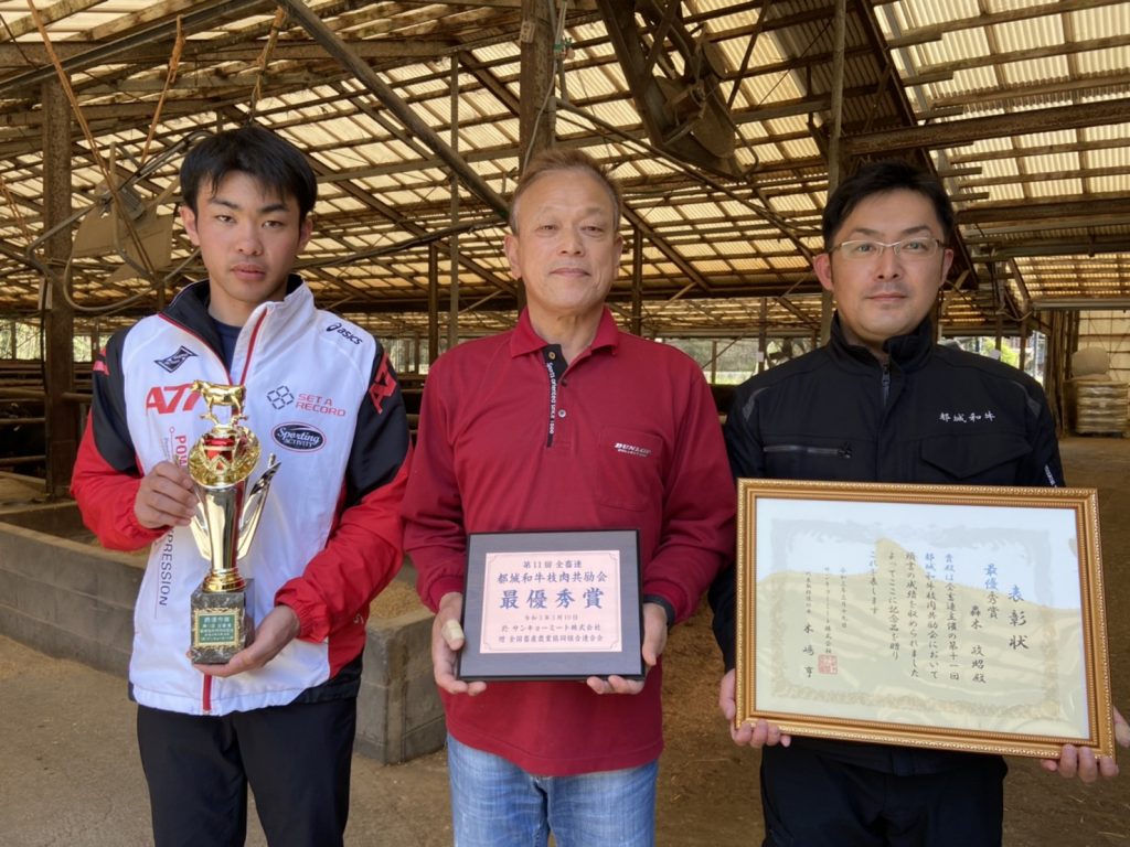 全国畜産農業協同組合連合会は3月19日、鹿児島県志布志市の(株)サンキョーミートで第11回全畜連都城和牛枝肉共励会を開催しました。これは、都城和牛の銘柄確立と肉質の改善、肥育技術の向上を目的としたもので、今回は全17頭の枝肉が出品。JA都城高崎支所の轟木政昭さん出品の枝肉が最優秀賞に選ばれました。
