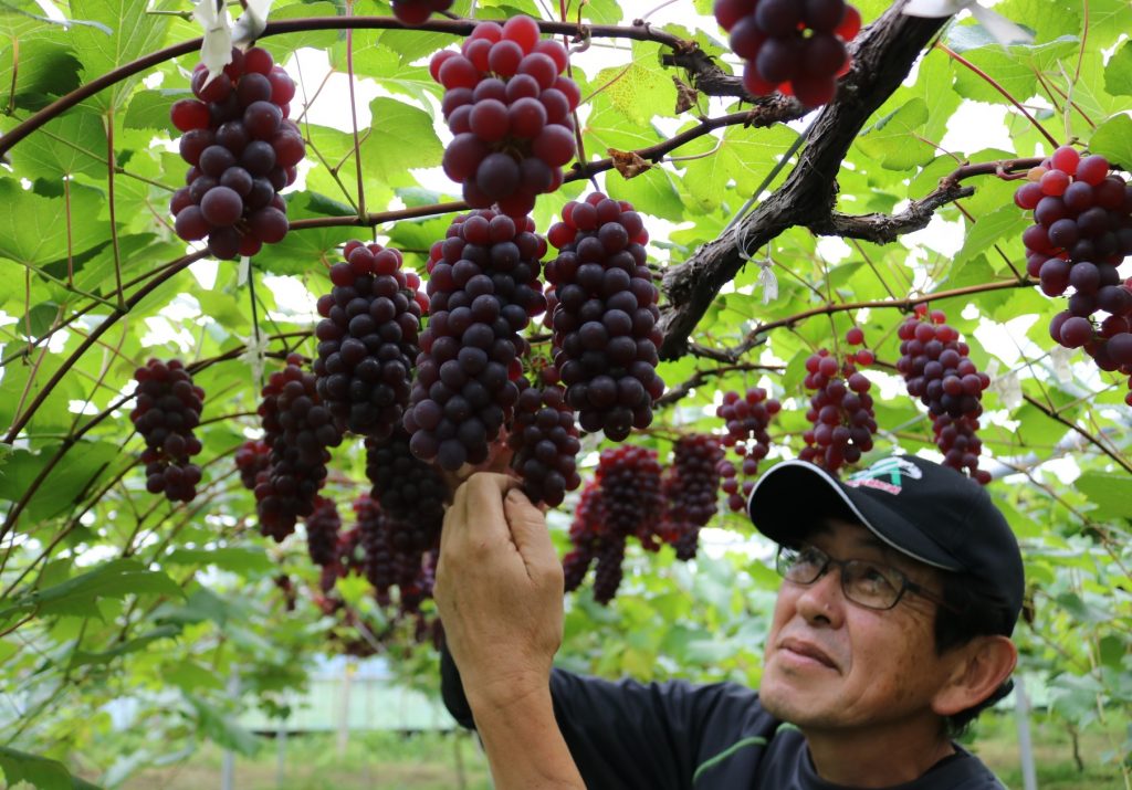 「デラウェアは種がなく小粒なので子供も食べやすい。家族でぜひどうぞ。今年は梅雨入りが非常に早く雨量も多いが、今のところ影響はない。裂果に気をつけて、収量を落とさず品質のよいものを出していきたい」と河野さん。