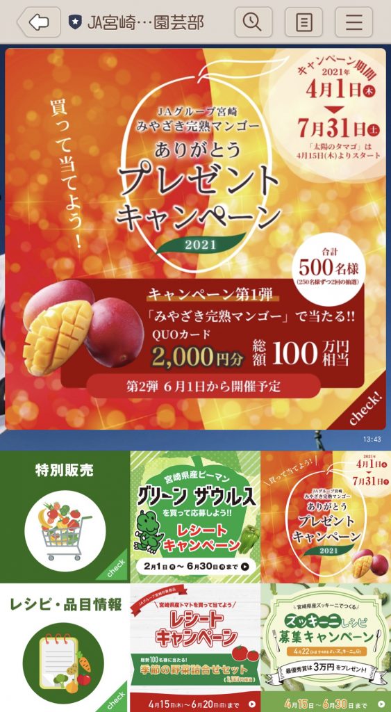 現在は「みやざき完熟マンゴーありがとうプレゼントキャンペーン」や「宮崎県産ピーマングリーンザウルスキャンペーン」などを実施中で、随時応募を受付けています。