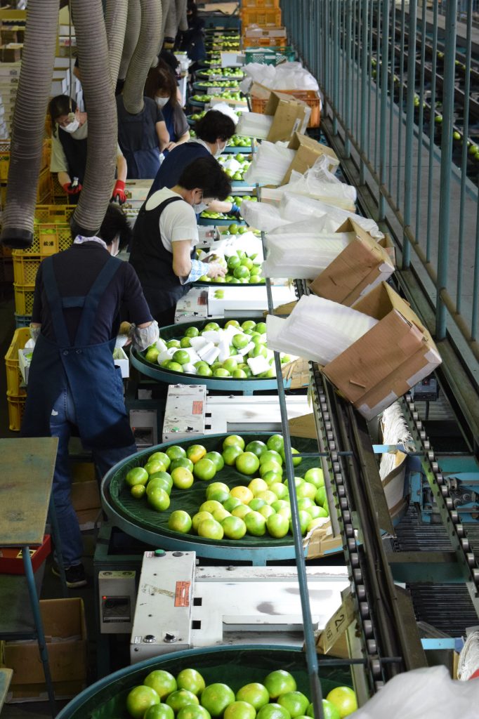 新富集送センター内で行われている南香みかんの箱詰め作業