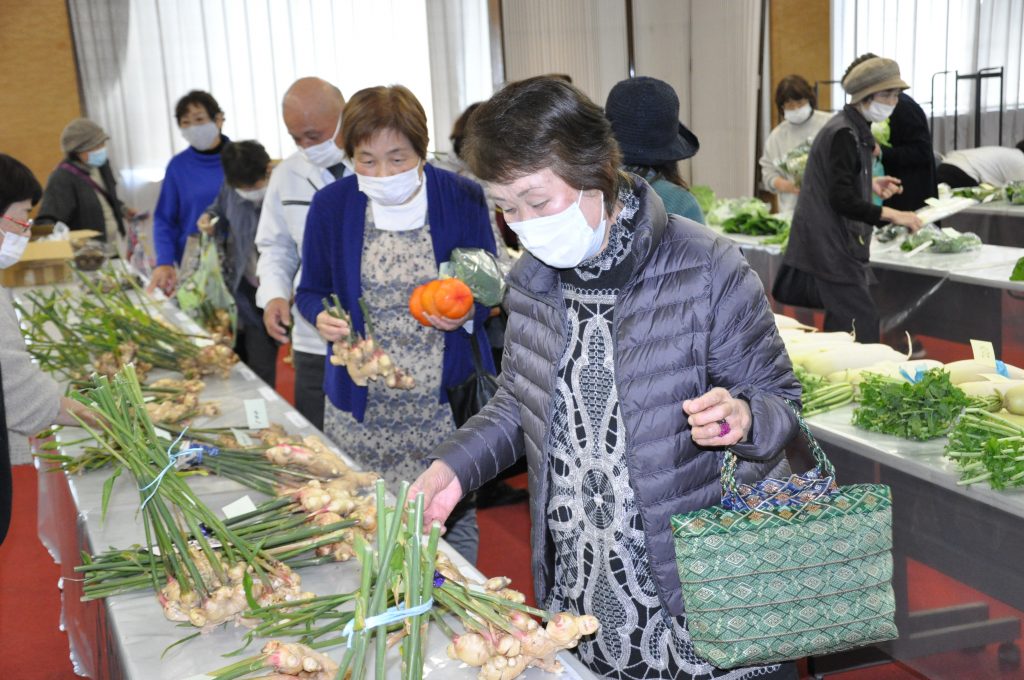 家庭菜園と地産地消を推進するためJA延岡女性部は11月25日、家庭菜園農産物品評会を開きました。初めての試み。会場のJA本店大ホールには根菜、葉菜、果菜、果実、特産品の5部門に83人から130点の応募がありました。審査後、一般公開した後に開かれた即売会は大好評で15分ほどで完売しました。