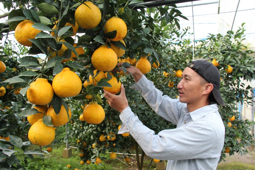 串間市都井地区の石上雄士さん(32)のハウス(25アール)では、鮮やかな黄色をした直径約10センチ、重さ350~450グラムの果実を収穫しました。