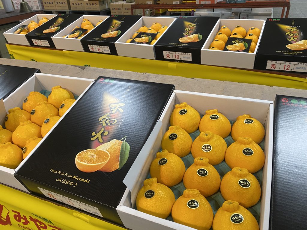 JA宮崎経済連とJAはまゆう果樹部会ハウスデコポン研究会は3日、宮崎市中央卸売市場(宮崎市)にてJAはまゆう産「ハウス不知火」の解禁PRを行いました。
