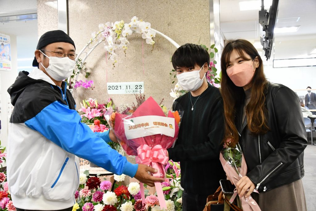 JA宮崎中央切花部会は「いい夫婦の日」の11月22日に宮崎市役所で婚姻届を提出したカップルに、思い出に残る記念日にしてもらおうと、花束を贈りました。花の消費拡大も目的としています。