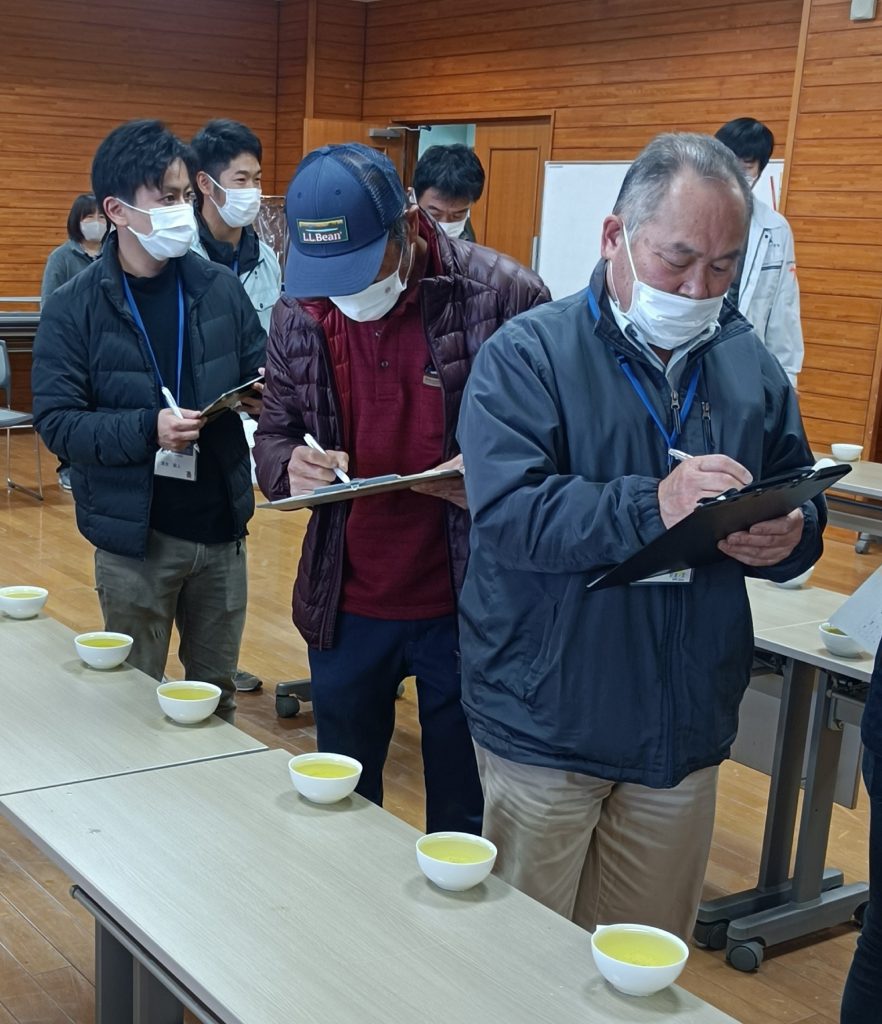 宮崎県都城市管内の茶生産者で組織する都城茶振興会は12月中旬、北諸県農業改良普及センターで、生産者が栽培、加工した茶を評価し合う求評会及び研修会を2年ぶりに開きました。生産者や関係者ら約24人が参加。今年産茶の出来栄えの評価や、来期以降の生産に向けた課題を検討しました。