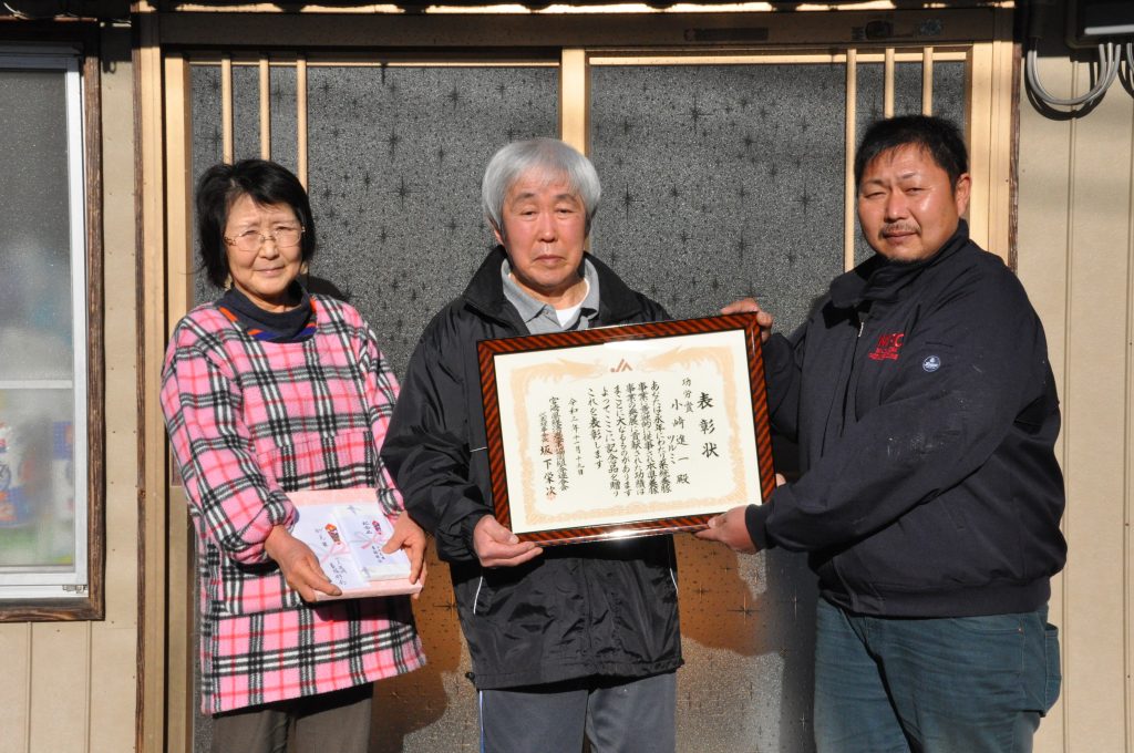 表彰状の贈呈は夫妻の自宅で行われました。JA宮崎経済連とJA延岡から各2人が出席。JA延岡養豚部会の伊東愛二部会長から表彰状と記念品が手渡されました。