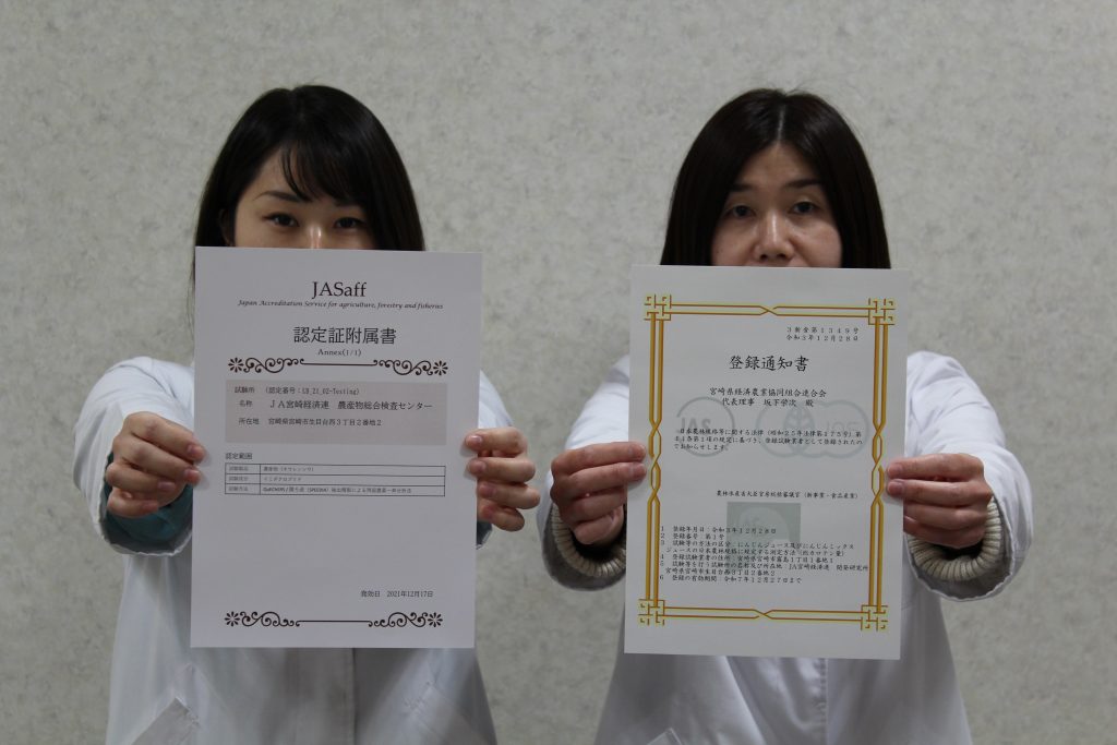 JA宮崎経済連開発検査課の事業所である農産物総合検査センターは(独)農林水産消費安全技術センター認定センターのISO/IEC17025の認定を、開発研究所は農林水産省JAS登録試験業者の登録を、それぞれ取得しました。