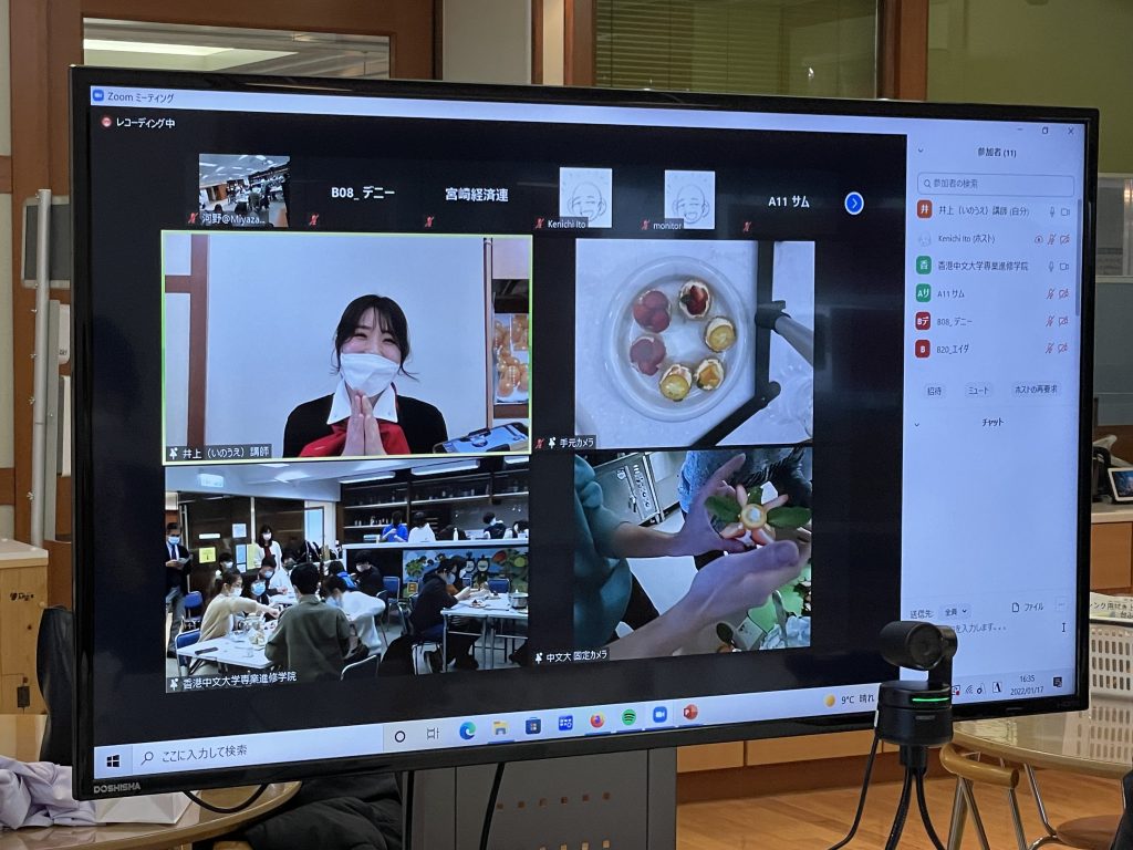 新型コロナウイルスの影響で渡航が難しいことから、宮崎市のキッチンスタジオと同大学をウェブで繋いで実施。野菜ソムリエの資格を持つ経済連の井上亜理沙主査が「たまたま」の歴史や栄養、料理方法を説明。学生らは説明に沿って「たまたま」のスイーツきんかんタルトを作り、試食しました。