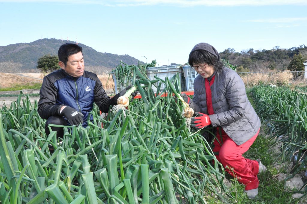1月下旬から始まったJA延岡ブランド「空飛ぶ新玉ネギ」の収獲が最盛期に入った。3月中旬まで続きます。生育状況は例年並。延岡市平原町の山本英則さん(58)は妻の美重さん(59)と連日、収穫、出荷作業に追われています。