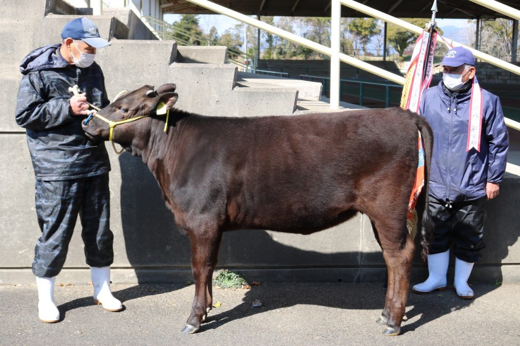 児湯郡市畜産農業協同組合連合会は16日、新富町の児湯地域家畜市場で2月期郡市子牛品評会を開きました。児湯郡および西都市から選抜された42頭の出品があり、厳正な審査の結果、都農町藤見の黒木靖富さんの子牛「みちか」がグランドチャンピオンに輝きました。