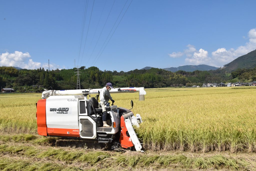 普通期水稲の稲狩りがJA延岡管内で始まりました。延岡市北方町の菊池光雄さん(70)は、9月30日から妻の文子さん(67)と同町曽木地域で約4ヘクタール(受託含む)の収穫に追われている。10月中旬まで続く。品種はヒノヒカリ。