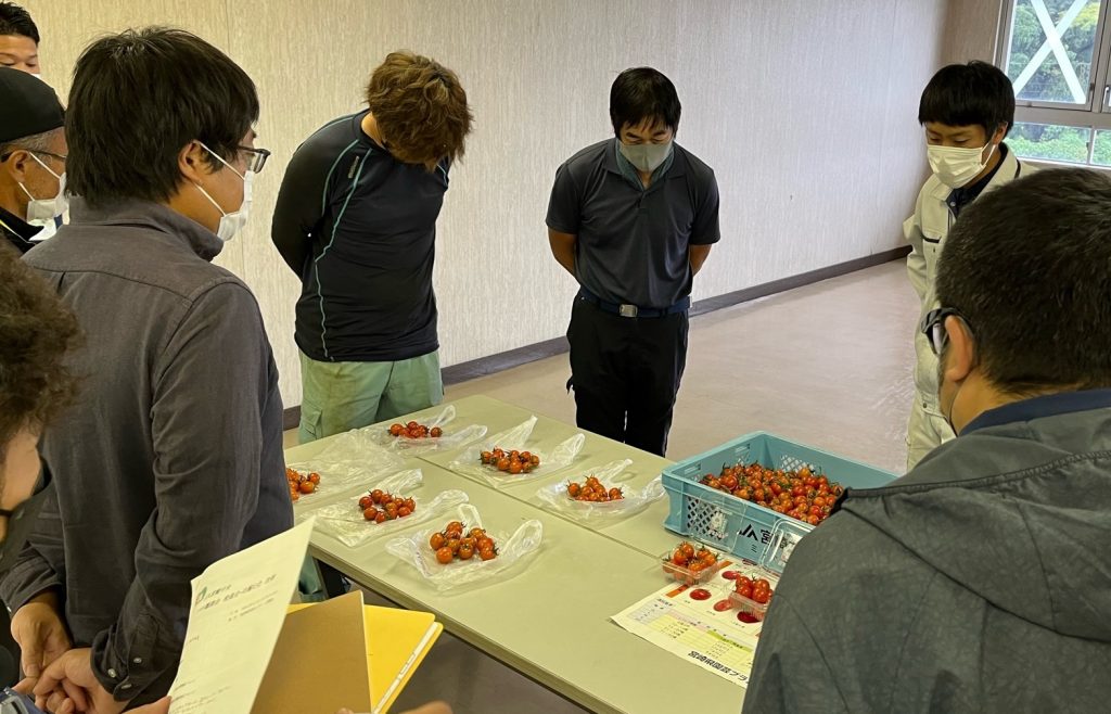 JA宮崎中央トマト類部会は11月上旬、ミニトマト、中玉トマト、大玉トマトの目揃え会を開きました。同部会の役員7人とJA集出荷場の職員や営農指導員らが出荷基準を確認した。
