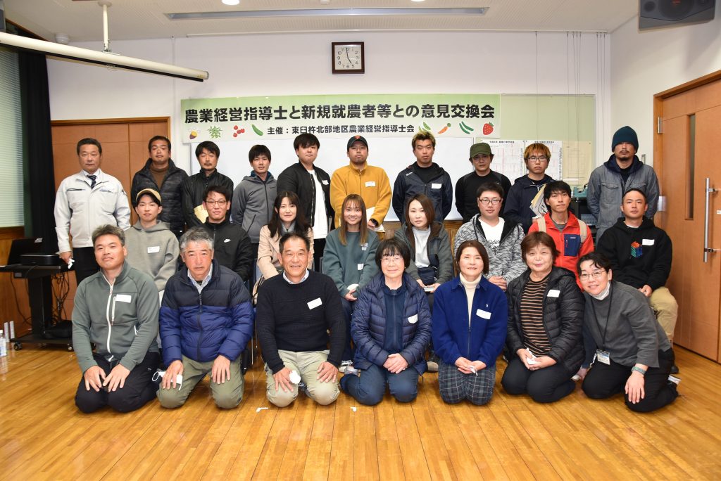 東臼杵北部地区農業経営指導士会は2月7日、延岡市の東臼杵北部農業改良普及センターで農業経営指導士と新規就農者との意見交換会を開きました。農業経営指導士7人と新規就農者17人(就農希望者、雇用就農者含む)が地域農業の目指す方向性など探りながら交流を深めた。