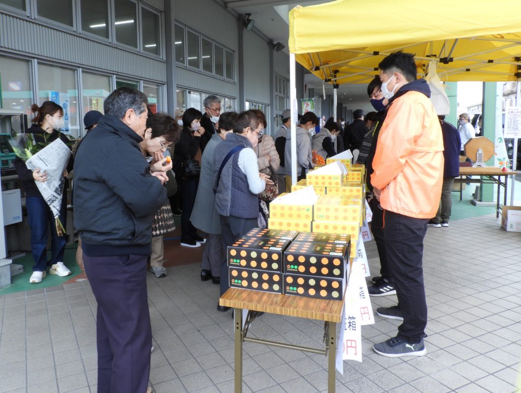 JA日向と美郷町さいごう完熟金柑部会は11日、八菜館ひゅうが店で完熟きんかん感謝祭を開きました。「たまたま」の試食販売や「たまたまエクセレント」の数量限定販売を行い、自宅用のみならず贈答用で購入する人も多く見られた。また、2000円の購入ごとにキンカンや加工品などが当たる抽選会も実施。オープンと同時に多くの人が訪れ、大盛況となった。