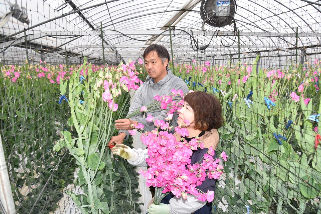 佐藤さんは脱サラで就農21年目。スイートピー栽培に乗り出したのは、初期投資や栽培面積が少なくてもできるから。試行錯誤の日々だったが、たゆまぬ努力で克服。日を追うごとに甘い香り、花弁の美しさに魅了され、今ではスイートピーにぞっこん。品種の特性や市場の好む色、流行など考慮し、現在はチェリー、ルージュ、クイーン、ラベンダーなど8種類を栽培する。