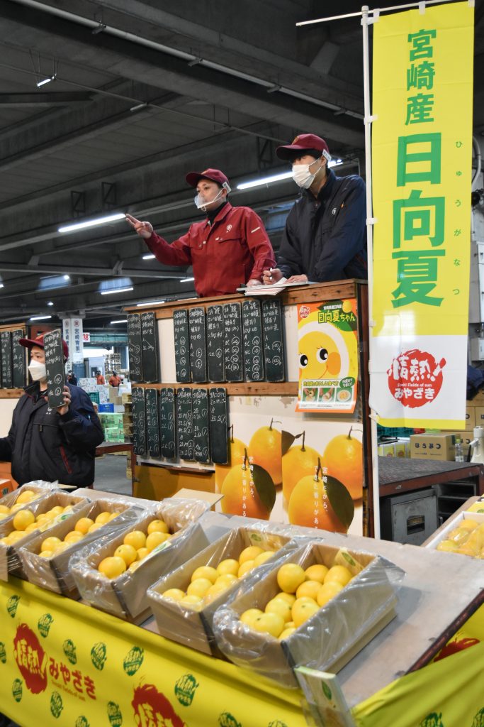 宮崎市中央卸売市場で行われた初せりでは、一箱(2.5kg化粧箱)がキロ1,200円と昨年キロ600円の2倍の値がついた。
