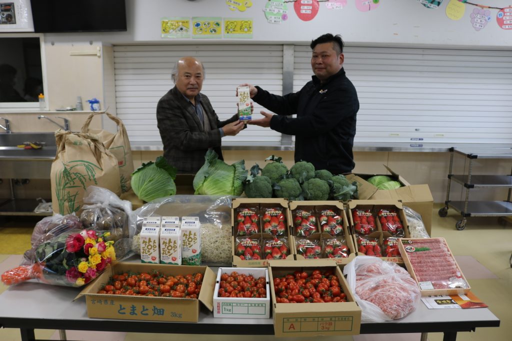 JA尾鈴青年部は2月下旬、川南町の児童養護施設「金鈴学園」に地元産の農畜産物を贈りました。地域貢献活動の一環として始め、今年で3回目。贈ったのは、米、イチゴ、キャベツ、ブロッコリー、ミニトマト、牛・豚肉、牛乳、バラなど13種類。すべて青年部員が丹精込めて育てたものばかり。