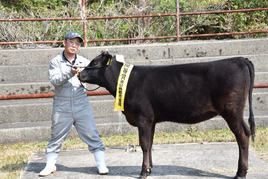 【宮崎・延岡】東臼杵郡市畜連は3月10日、延岡市の延岡家畜市場で3月期子牛郡共進会を開きました。延岡市、東臼杵郡から40頭が出場。同市石田町の織田直行さん(40)の「ふくひさ」(父・富久竜、母の父・満天白清、母の祖父・勝平正)がチャンピオン(優等1席)に輝いた。発育良好で体積豊か、輪郭の鮮明ささなどが評価された。