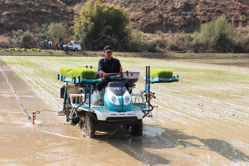 日南市北郷町の倉岡康浩さん(47)の田んぼでは同日、家族や親戚ら6人で手分けして田植え機に苗を積み込み「コシヒカリ」2.5ヘクタールを作付けた。