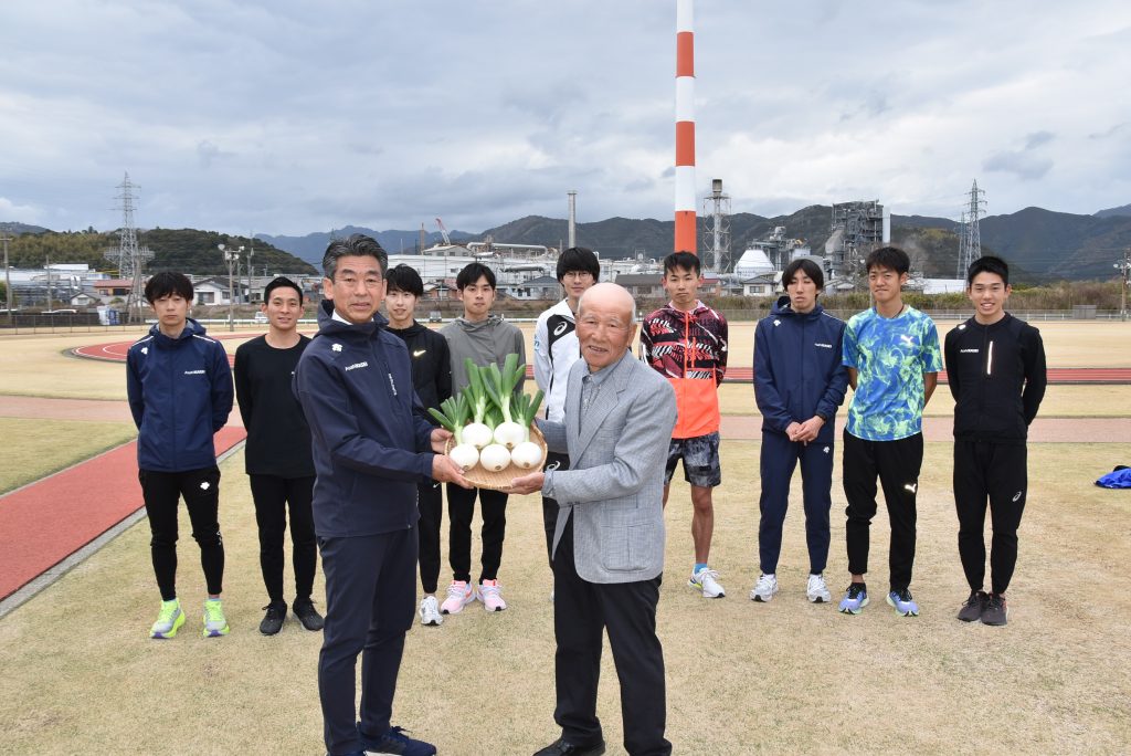 三雲部会長は「私たちが丹精して育てた『空飛ぶ新玉ネギ』を食べて日々の練習に励んでほしい。さらなる活躍を期待している」と選手たちを激励。河野さんは、自ら育てた玉ネギを食べて後輩たちに頑張ってほしいとの願いを込めて贈った。西村監督は「血液サラサラ、免疫力アップなど玉ネギの効能は聞いている。今年の世界陸上、来年のパリオリンピック、5月の『ゴールデンゲームスinのべおか』に向けて練習を強化したい」と抱負を述べました。