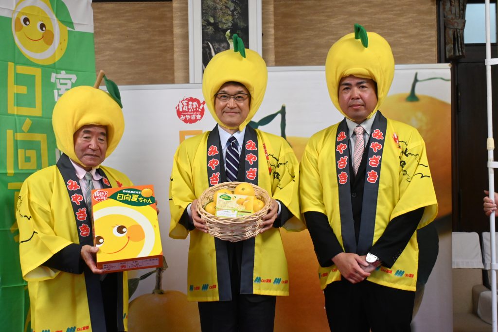 宮崎県果樹振興協議会日向夏部会の河野秀範部会長ら4名は22日、露地日向夏が出荷最盛期を迎えるのを前に、宮崎県の河野俊嗣知事へ贈呈しました。生産状況や販売状況を報告した。